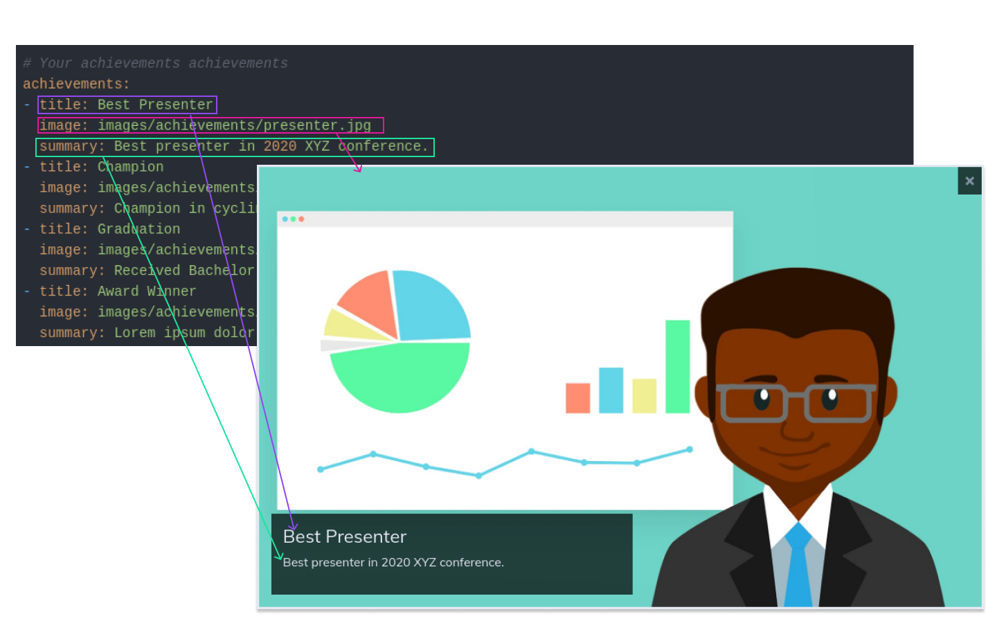 The following image shows how the contents of achievements.yaml are mapped into the Achievements section.